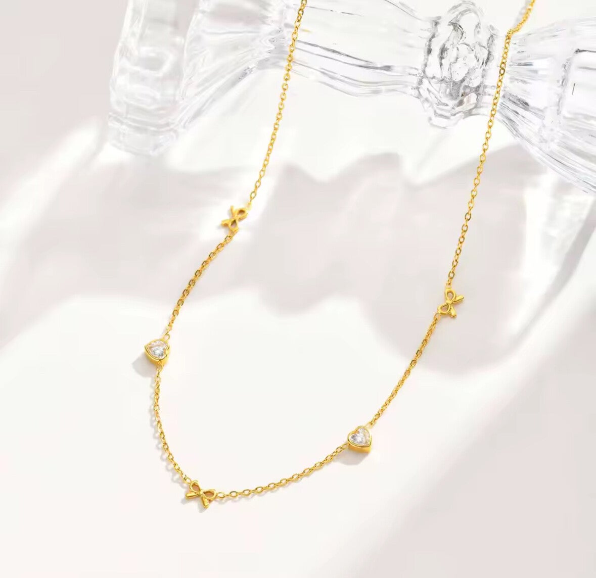 Elke ketting is ontworpen met oog voor detail: fijne gouden schakels, delicate strikjes en subtiele sparkle accenten die jouw look nét dat beetje extra geven. Perfect om solo te dragen voor een minimalistische uitstraling of te layeren voor een speelse, stijlvolle touch.